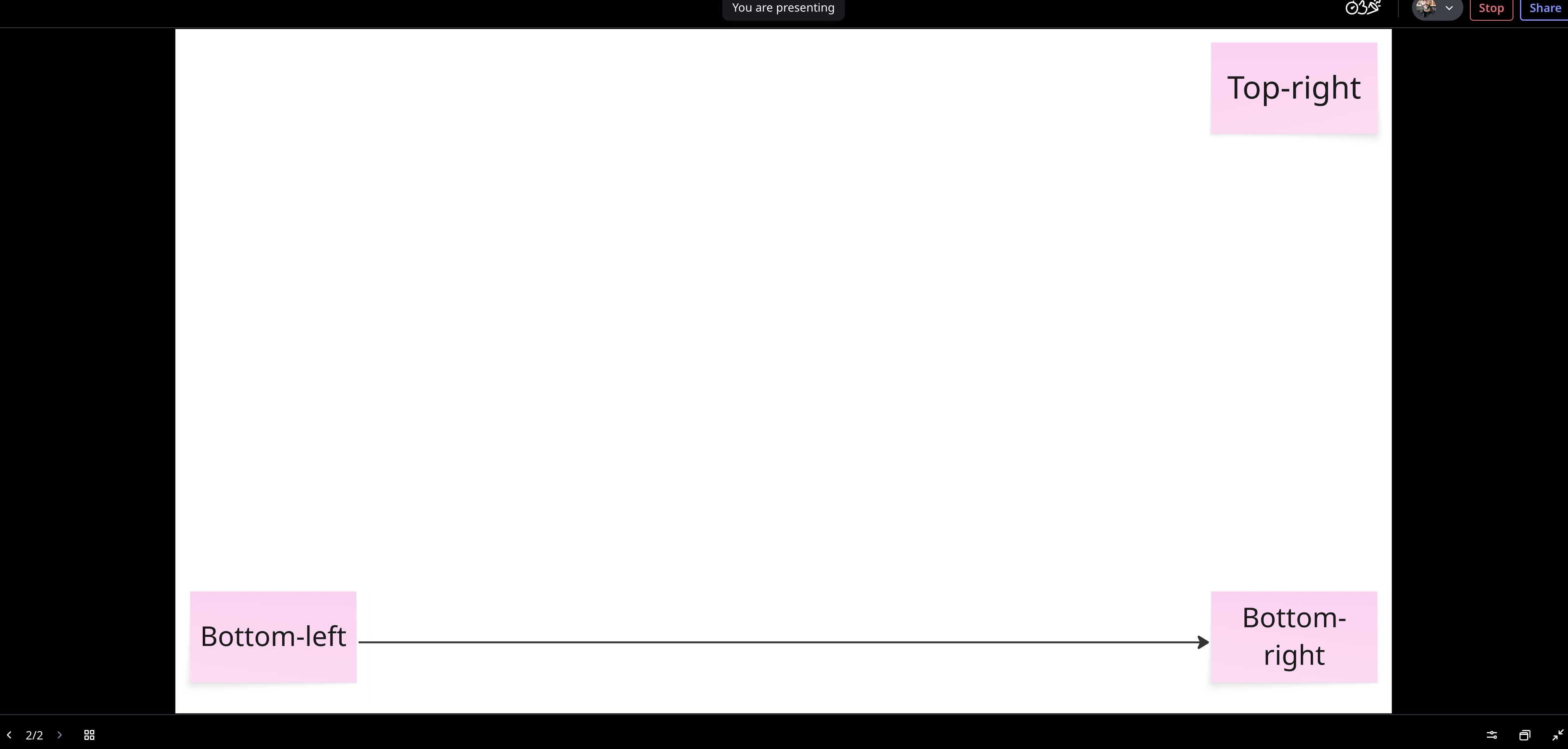 Abre el modo de presentación en pantalla completa con herramientas de navegación simplificadas, participación y reacciones, además de preferencias. También puedes detener y compartir la presentación. En la app móvil, para iniciar la presentación, selecciona el marco de las diapositivas, luego haz clic en la flecha de Play en la barra de herramientas.NOTA: Durante abril, Miro está implementando un modo de presentación mejorado para diapositivas, que incluye una vista más limpia y simplificada, y controles directos para la transferencia. Los usuarios con el diseño antiguo aún pueden participar en presentaciones que utilicen el nuevo modo de presentación de diapositivas.