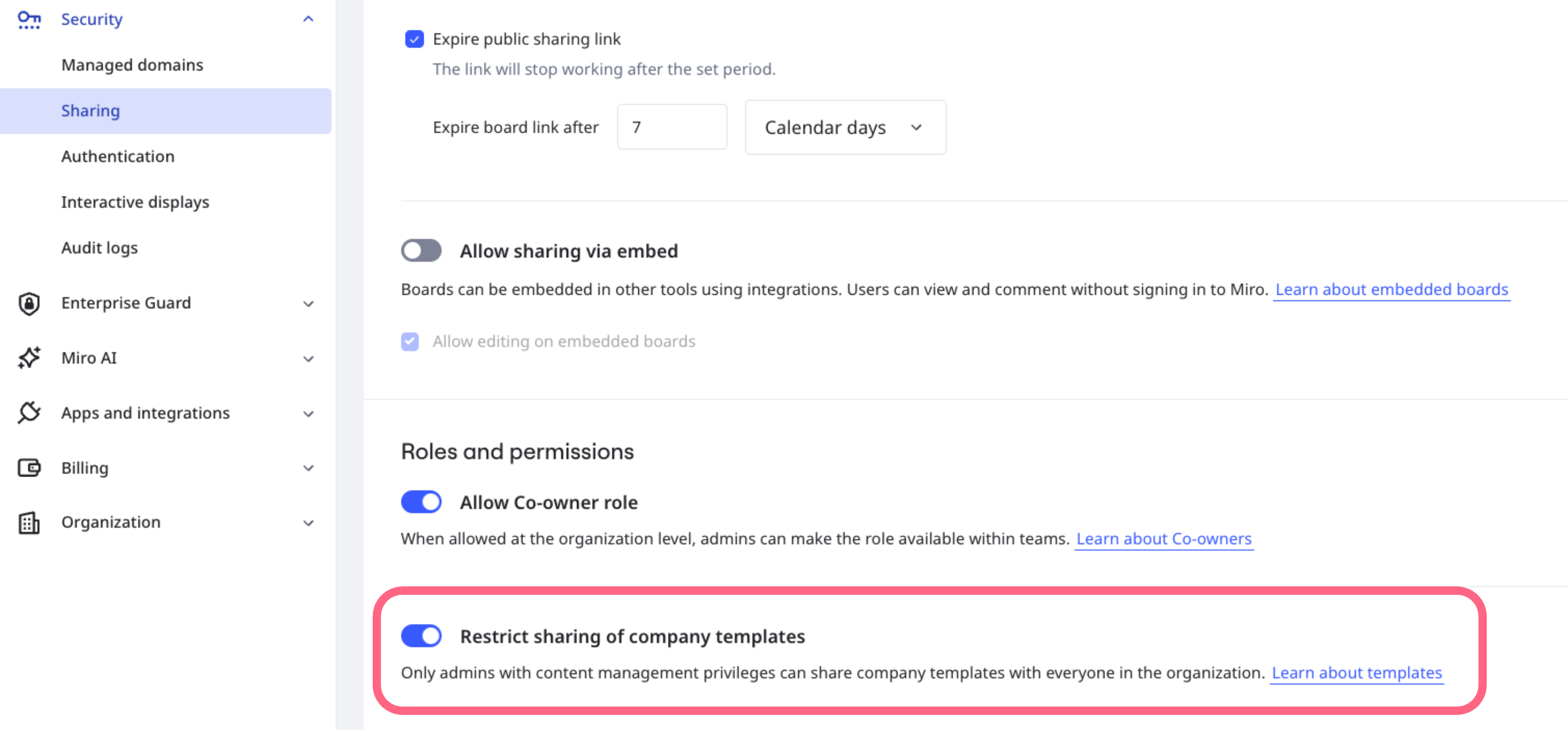 - En Roles y permisos, desactiva el interruptor Restringir el compartir de plantillas de la empresa.