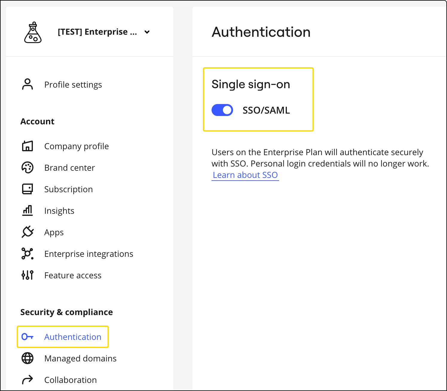 - Ve a Configuración de empresa > Autenticación > Inicio de sesión único.