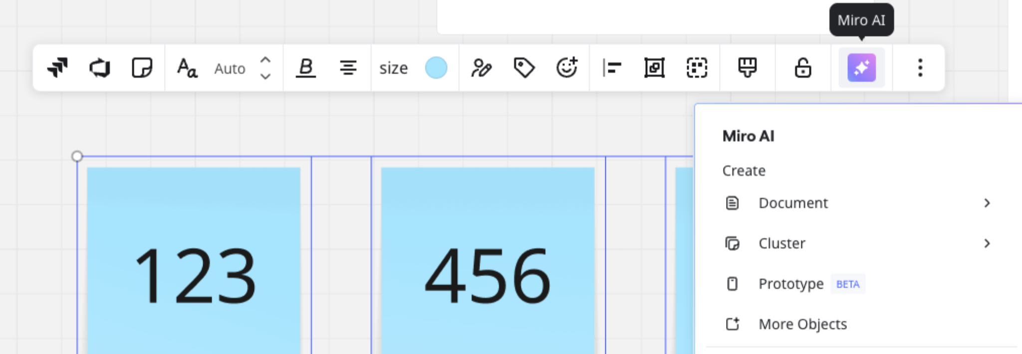Par exemple, sélectionnez un groupe de pense-bêtes. Une barre d'outils apparaît au-dessus de votre sélection. Cliquez sur Miro IA, et le menu contextuel s'ouvre.