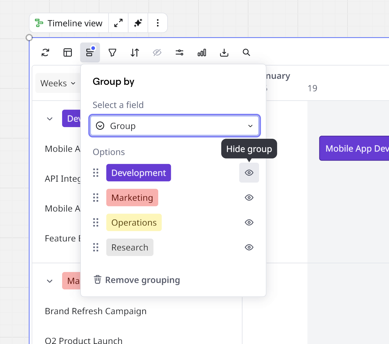 - Cliquez sur Masquer le groupe pour masquer un groupement du planning. Pour afficher le groupe, cliquez sur Afficher le groupe.