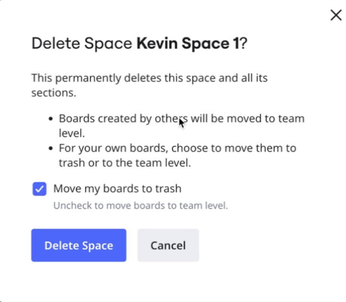 En tant que propriétaire de l'espace, vous pouvez supprimer votre espace. Les tableaux créés par d'autres membres de l'équipe dans votre espace sont déplacés au niveau de l'équipe.