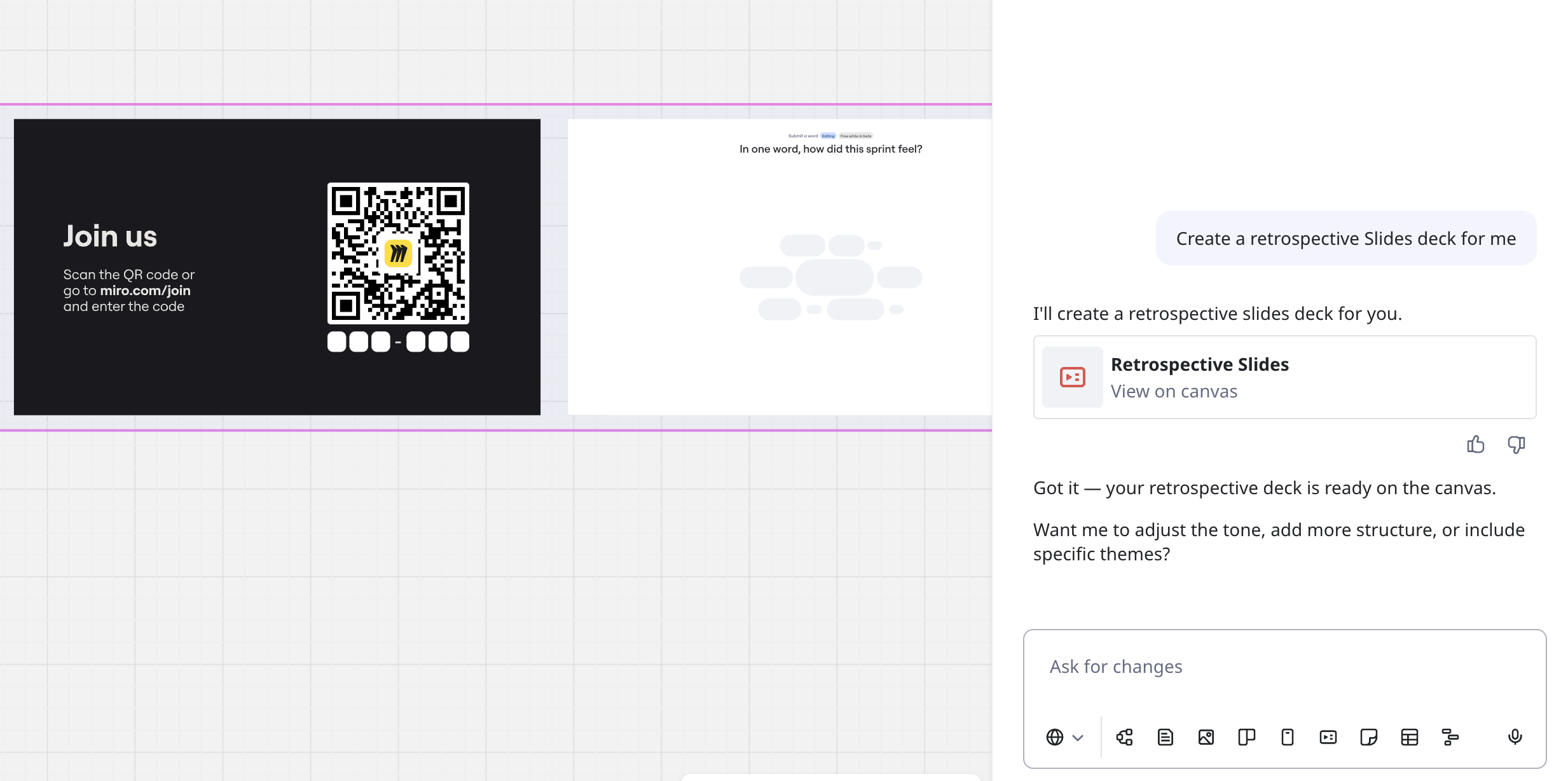 Lance les partenaires d’IA et vous permet de donner des prompts à Miro IA pour générer des améliorations, des ressources, ou recommander des moyens de simplifier votre présentation, par exemple. -