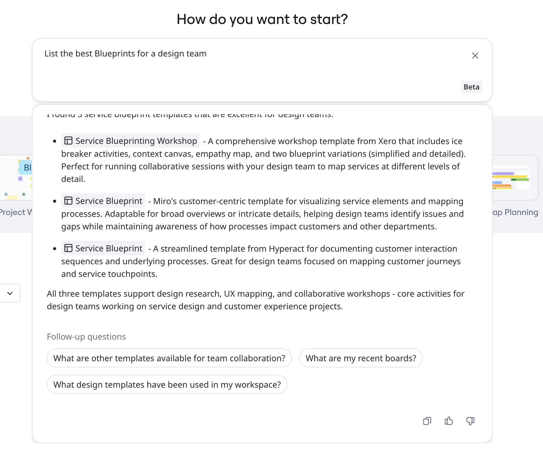 Obtenez des recommandations pour les modèles les plus pertinents en fonction de votre recherche. Par exemple, recherchez "J'ai besoin d'aide pour faire un roadmap avec mon équipe", ou "Quel est le meilleur modèle pour une rétrospective ?".