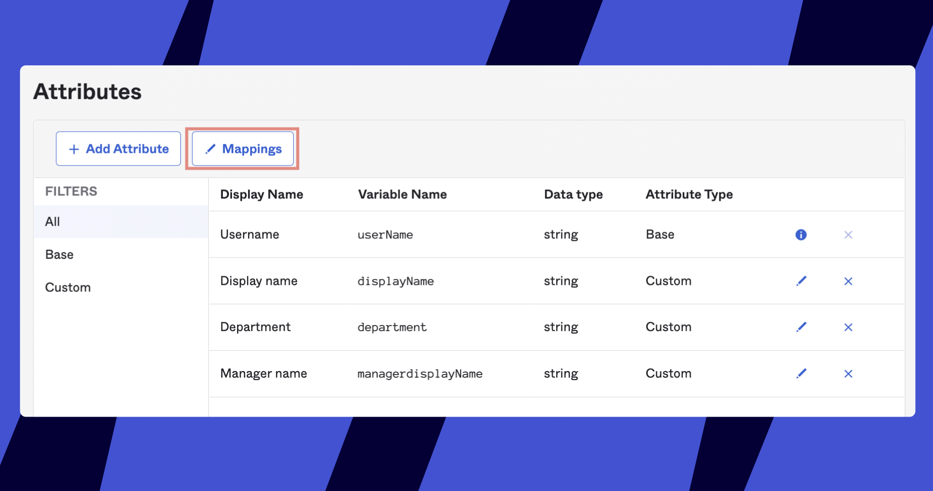Votre nouvel attribut n'est pas mappé et est par défaut caché sous la coupe dans la liste des attributs de l'onglet Provisioning de l'application Miro. Cliquez sur Afficher les attributs non mappés > Modifier votre attribut :