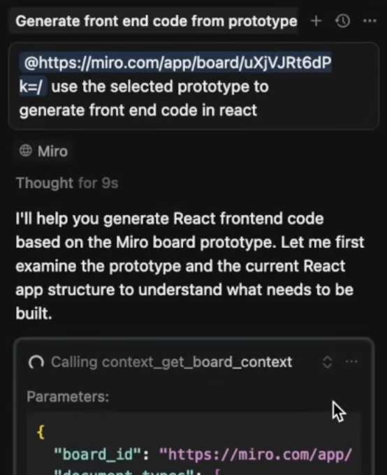 Cursor のようなコードベース AI エディターは、Miro ボード URL とボード ID を受け取り、プロトタイプに基づいたコードを生成します。