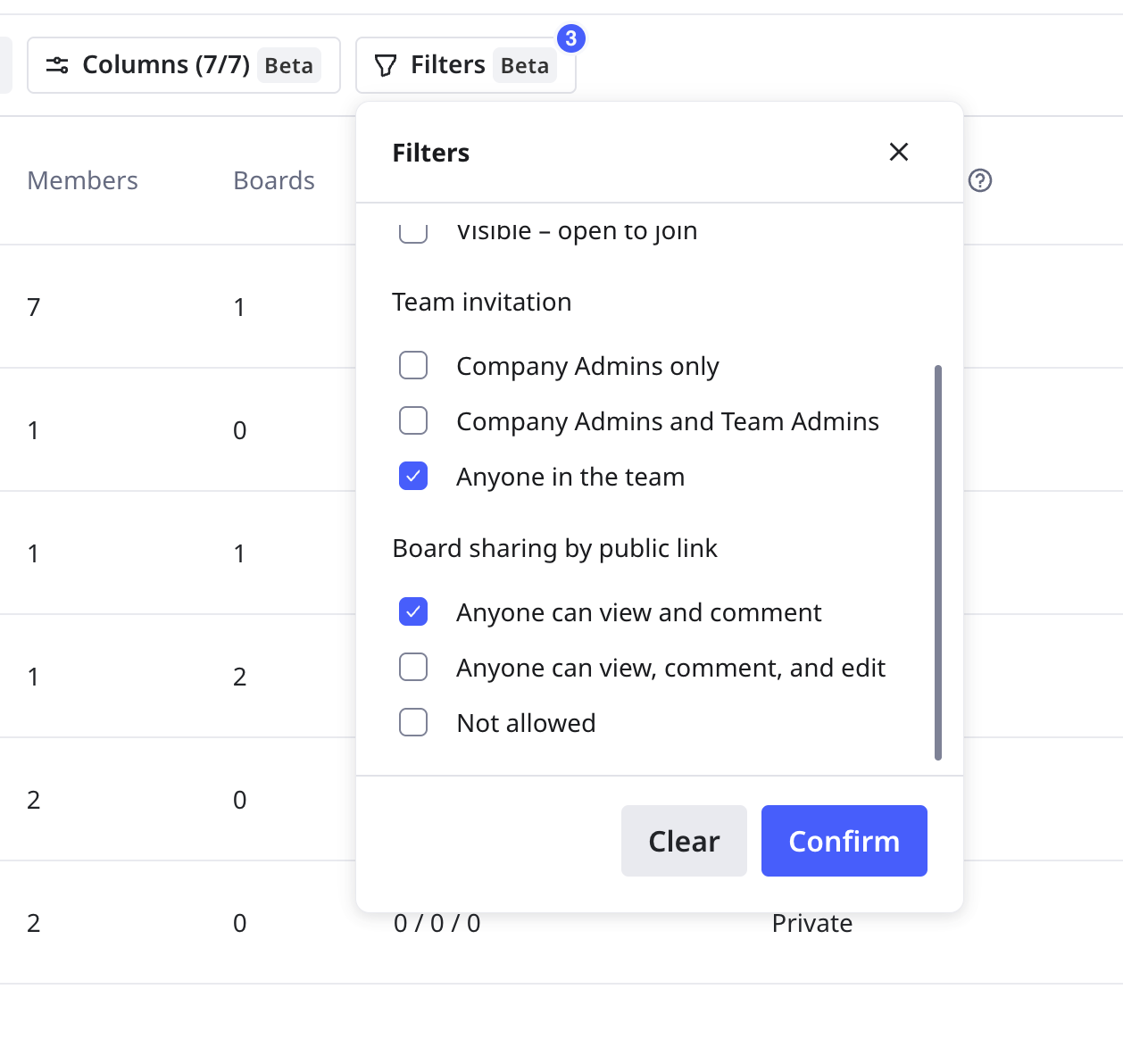 필터를 클릭하여 기준에 맞는 팀만 표시합니다. 예를 들어, 어떤 팀이 팀의 누구나 새로운 멤버를 초대할 수 있도록 허용하는지 확인하고 싶습니다.