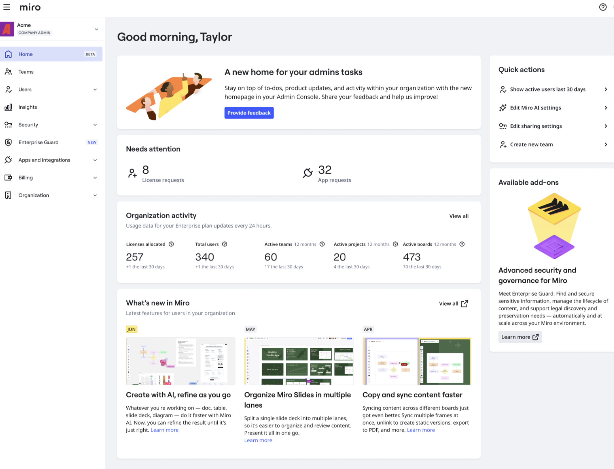 관리자 콘솔에는 조직 내 활동을 모니터링하고, 라이선스 및 앱 요청을 확인하며, 빠르게 조치를 취할 수 있는 홈페이지가 포함되어 있습니다. 관리자 홈은 Miro의 새로운 소식에 대한 섹션도 제공하여 제품 업데이트를 항상 최신으로 유지할 수 있게 합니다.