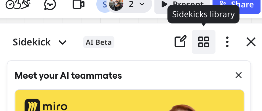 - Miro 캔버스에서 생성 바 위의 Sidekicks를 클릭하세요.