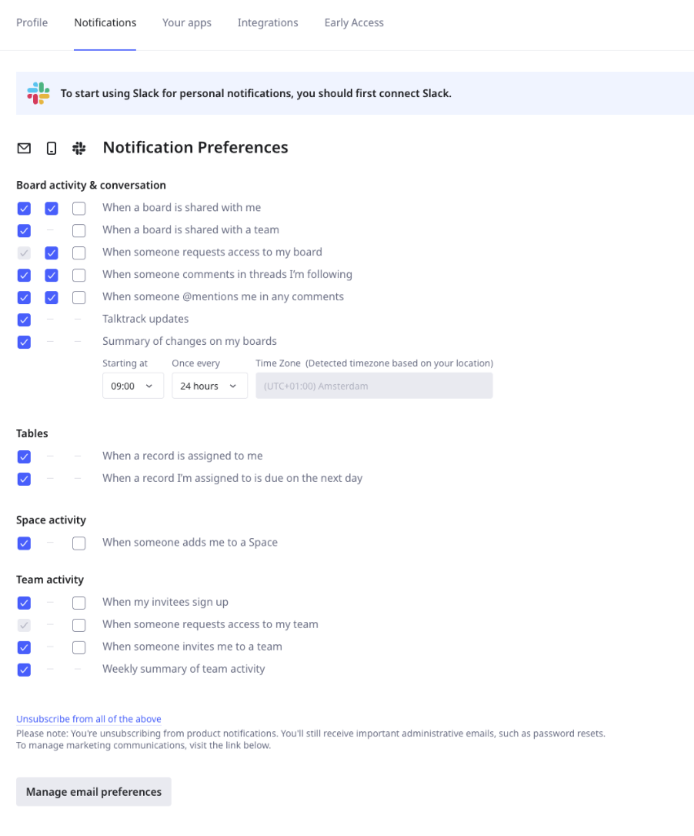 보드 활동 및 대화, 테이블, 스페이스, 팀 활동에 대한 알림 선호 설정을 이메일, 모바일, Slack으로 업데이트할 수 있습니다.