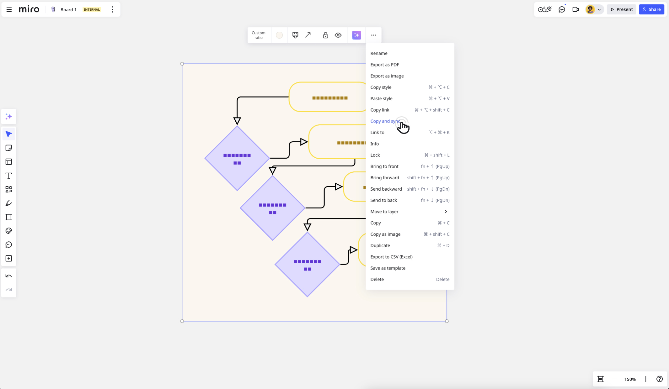 Tworzenie zsynchronizowanych kopii jest dostępne dla użytkowników z profilem Miro oraz dla odwiedzających z uprawnieniami do edycji. Jeśli masz tylko uprawnienia do wyświetlania lub komentowania, musisz zarejestrować się w Miro i uzyskać uprawnienia do edycji, aby tworzyć zsynchronizowane kopie.
