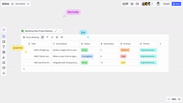 Rozpoczynaj i uczestnicz w rozmowach wideo bezpośrednio na tablicy Miro. Wystarczy kilka kliknięć, aby zaprosić wszystkich współpracowników tablicy do szybkiego synchronicznego lub zaplanowanego spotkania. Możesz udostępniać swój ekran, stosować filtry kolorów do swojego awatara i przełączać kamerę oraz mikrofon.