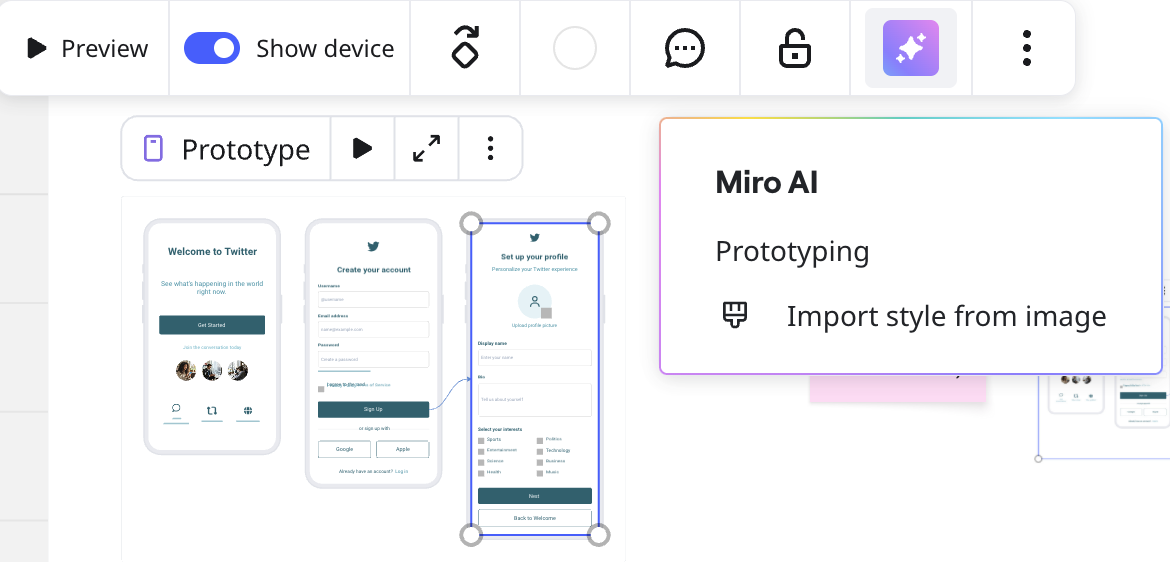 W tej części opisano, jak rozpocząć prototypowanie z Miro AI. Aby dowiedzieć się, jak zacząć ręcznie, zobacz Biblioteka prototypowania.