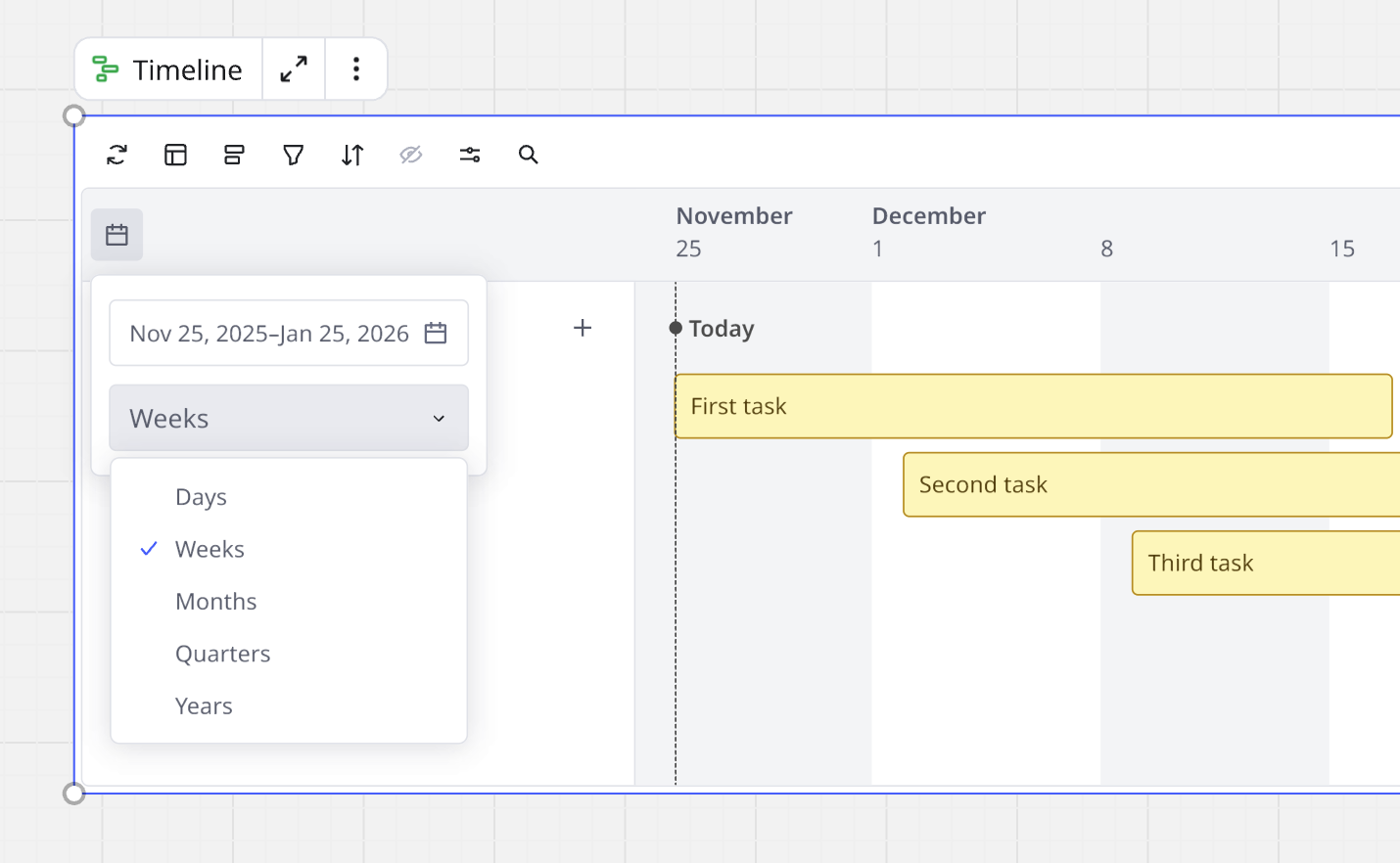 Você também pode usar o menu suspenso para selecionar se deseja ajustar a Timeline para Dias, Semanas, Meses, Trimestres ou Anos.