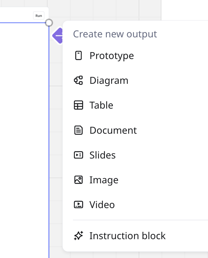 O menu Criar nova saída é aberto. - Para completar seu fluxo, repita as etapas 1 a 6 para quantos formatos ou blocos de instrução forem necessários para seu resultado.